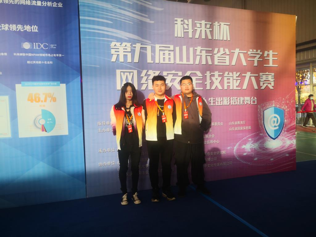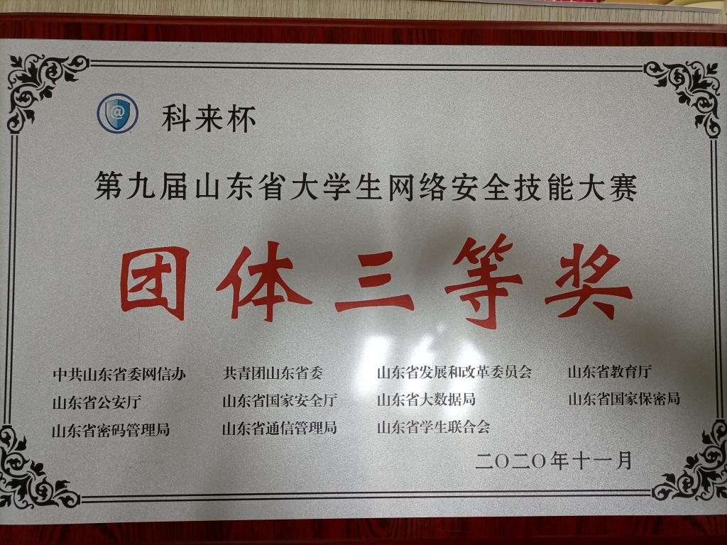 2020年11月8日,“科来杯”第九届山东省大学生网络安全技能大赛颁奖仪式在山东大学青岛校区隆重举行,来自全省50所高校的选手以及150名网络安全爱好者参加。经过7个小时的激烈角逐,大赛最终产生大学生团体、大学生个人和网络安全技术爱好者个人三组奖项的特、一、二、三等奖。我院学子获得团体三等奖一项。