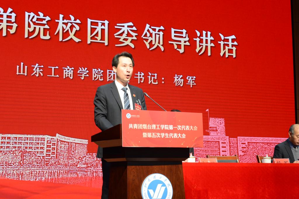 山东工商学院团委书记杨军代表兄弟院校向大会的召开表示祝贺!他表示,烟台理工学院团委在共青团工作领域取得的成绩,为兄弟院校共青团和学生会的发展提供了许多可以借鉴的宝贵经验。他希望与烟台理工学院团委互通有无、深化交流、携手共创学校共青团事业的美好前程。
