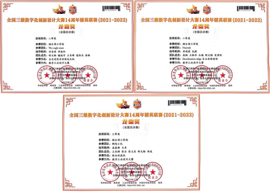 全国三维数字化创新设计大赛(简称“全国 3D 大赛”或 3DDS),是在国家大力实施创新驱动发展战略、推动实体经济和数字经济融合发展的时代背景下开展的一项大型公益赛事,以“三维数字化”与“创新设计”为特色,突出体现科技进步和产业升级的要求,是大众创业、万众创新的具体实践。此项赛事已被教育部列入全国高校学科评估体系。全国3D大赛14周年精英联赛(2021-2022)自2021年9月22日启动以来,全国31个省/直辖市/自治区赛区,大学生组和研究生组共有452所高校,850个院系报名参赛,共提交了7692件初赛作品;职业组共有55个企/事业单位报名参赛;青少年组共有76个院校报名参赛。各赛区、各院校经初赛/校赛、网络海选等方式,共推荐报送省赛团队3681个,作品3681件。我院推选数字工业设计组作品3项进入全国总决赛,喜获佳绩。