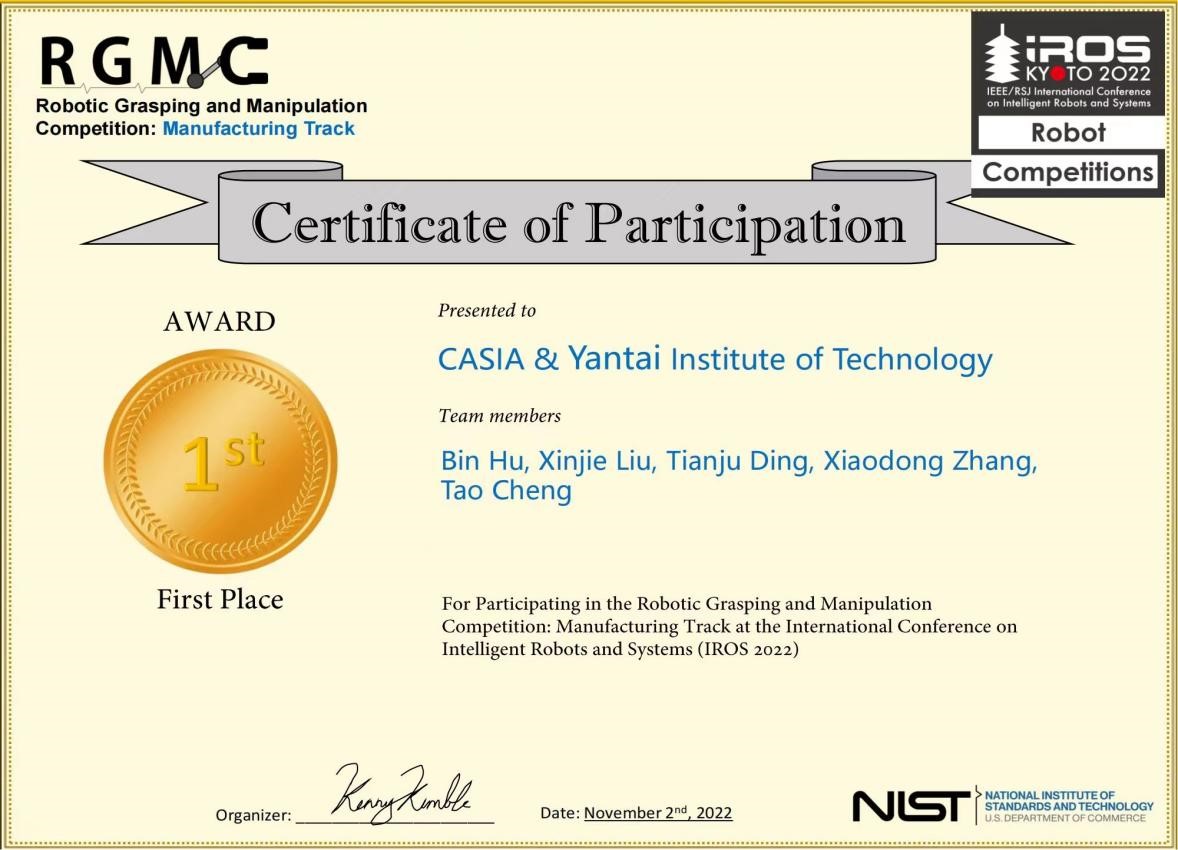 本次IROS工业组“机器人抓取与操作”竞赛于10月中旬正式举行,我校参赛队员包括人工智能学院机器人工程专业2020级学生丁天举和2021级学生程涛。此次比赛为线上举行,在人工智能学院胡斌博士的带领下,团队重点考察机器人多种操作技能任务,突破技术壁垒、掌握技术核心,凭借各方面的技术优势激烈角逐。最终,人工智能学院参赛队伍获得了170分的高分,以足足领先第二名81分的绝对优势,勇获IROS工业组世界冠军!