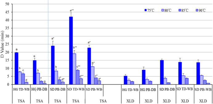 图3:75 、80 、85和90℃ 下高凝胶和标准鸡蛋蛋白粉中沙门氏菌的D值。