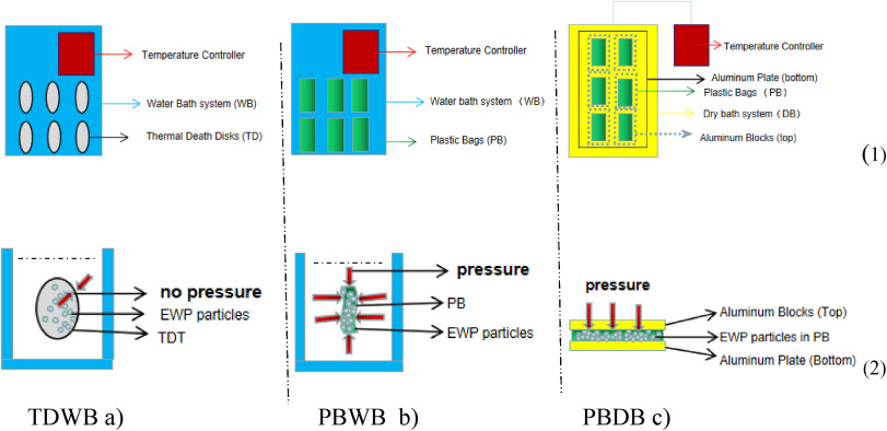 图2:(1)加热系统示意图与(2) TDWB a),PBWB b) 和PBDB c)处理鸡蛋蛋白粉的直观解释图。