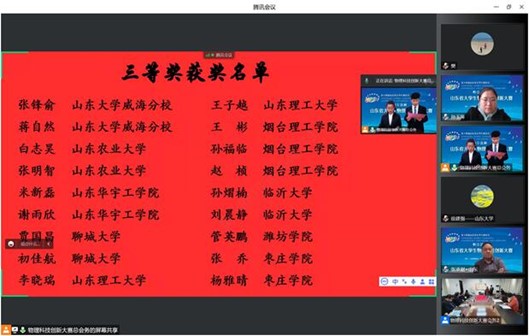 大赛共有223项优秀作品进入决赛,项目涉及力学、光学、电磁学等多个物理学学科分支。赛事采用线上评比,我校派出1位评审专家,1位带队教师,8组参赛队伍24名同学参加,比赛现场设置在3教S516创新实验室。经过评比,我校共取得了山东省一等奖2项、二等奖3项、三等奖3项的好成绩,得到了大赛组委会的高度评价。