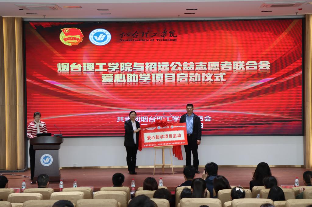 启动仪式上,校长助理杜娟与招远公益志愿者联合会会长冯晓伟共同为爱心助学项目揭牌,共青团招远市委及招远市公益志愿者联合会为烟台理工学院赠送锦旗。