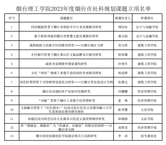 近日,烟台市社会科学界联合会发布了《2023年度烟台市社科规划课题拟立项名单公示》的通知,我校推荐课题中有13项成功获批立项,为我校20周年校庆增光添彩。