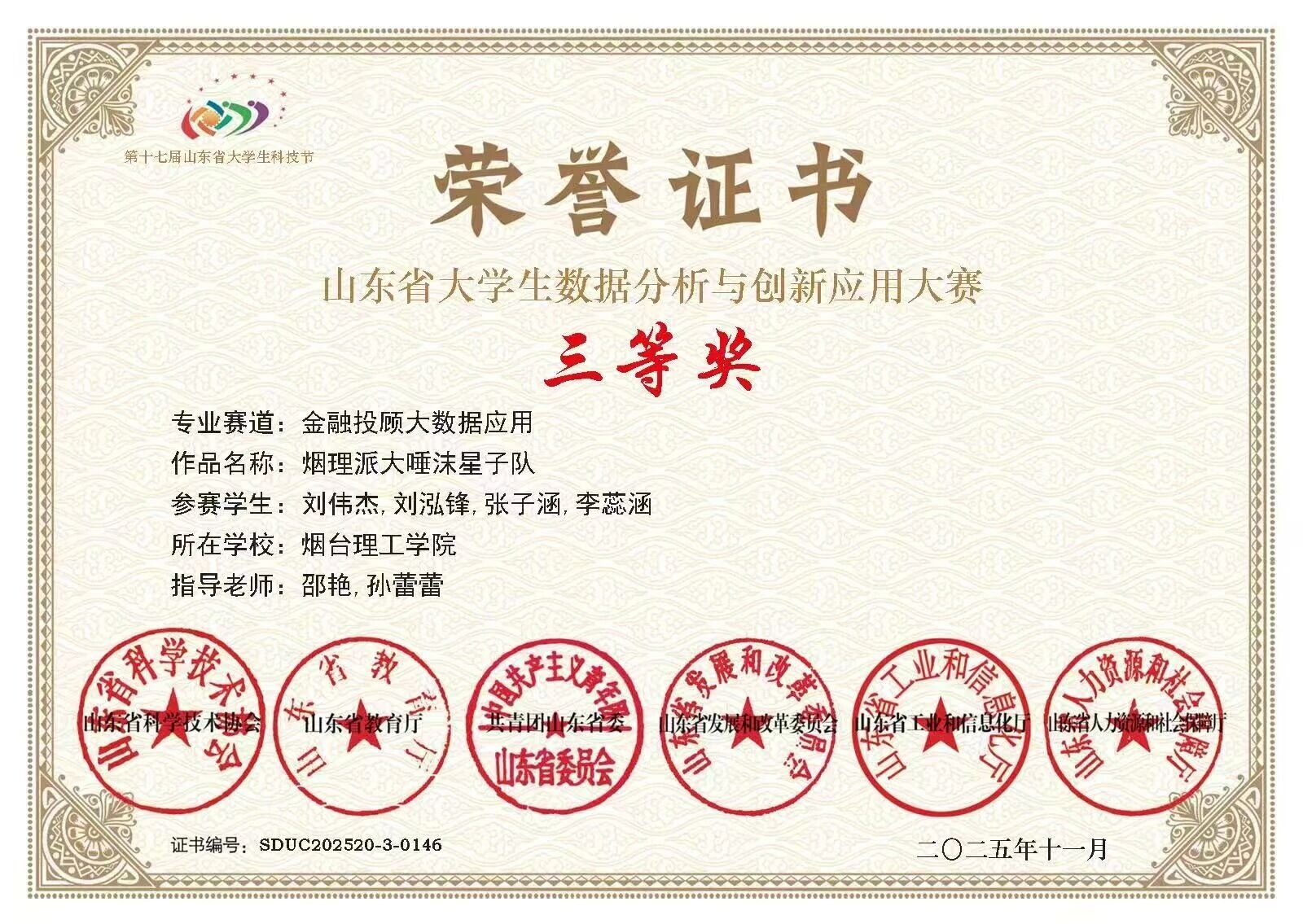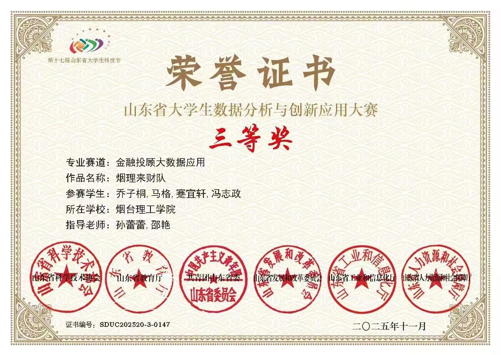 近日,第十七届山东省大学生科技节——山东省大学生数据分析与创新应用大赛金融投顾大数据应用赛道决赛圆满落幕。本次赛事由山东省科学技术协会、山东省教育厅、共青团山东省委等六部门联合主办,是全省高校范围内的高水平学科竞赛,吸引了省内众多高校的优秀队伍同台竞技。学院学子凭借扎实的专业功底和出色的团队协作能力脱颖而出,共荣获山东省二等奖一项、三等奖两项,并荣获“优秀组织奖”。