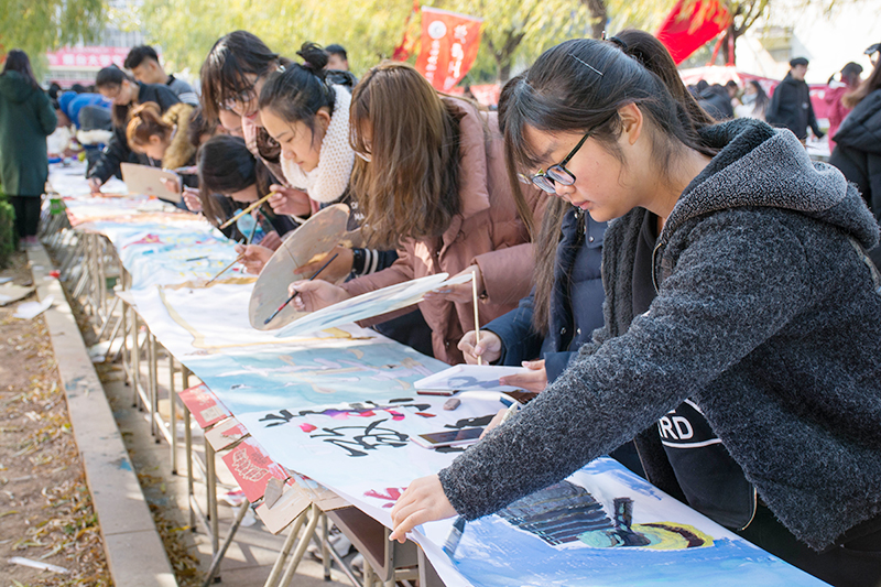 1125日上午,由院团委主办的社会主义核心价值观百米长卷艺术创作大赛在餐厅前甬道举行,各系积极组织学生参加活动。