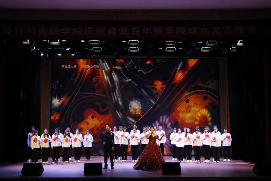 2021年12月15日晚,会计与金融学院于综合楼一楼报告厅举办庆祝建党百年暨学院成立文艺晚会。副校长张仁杰,校长助理莫红菊,校团委书记申海滨,经济管理学院党总支书记高照龙,组织统战部副部长温少斐,文法学院党总支副书记王晓黎,食品与生物工程学院党总支副书记赵蓓,会计与金融学院院长孙桂娟、党总支书记曹钊庆、副院长孔令一,以及会计与金融学院全体教工参加。