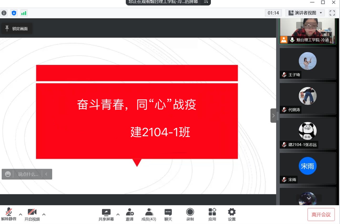 为贯彻落实学校关于疫情防控工作的部署和要求,加强疫情防控期间学生的思想教育和价值引领,保障学校正常秩序。建筑工程学院积极响应防疫号召,以提高师生的防范意识,保证师生身心健康,营造良好校园环境为目的,组织各班开展奋斗青春、同心战“疫”线上主题班会。