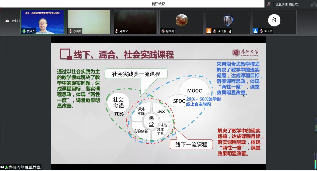 29日下午,深圳大学教授、广东省教学名师、国家级一流本科课程负责人费跃农围绕“一流课程建设与申报材料准备”做了主题报告。他首先介绍了线上、虚拟仿真、线下、混合、社会实践课程等一流课程的基本形态和建设重点。并重点以混合式一流课程为例,介绍了其申报书的撰写。他指出申报材料需要满足的3个关键点,一是逻辑脉络清晰,二是材料翔实、有说服力、支撑观测点,三是展示方法有效、高效。他对申报书及相关附件(支撑材料)内容进行了详细解读。并对申报书中教学团队、课程目标、课程建设、课程内容、课程教学设计、课程评价与改革成效等相关内容进行了详细讲解。培训班认真听取了一流课程建设领域名师专家进行专题讲座,帮助教师理解一流课程申报标准、熟悉申报流程与材料等,为国家级一流课程申报及课程建设奠定坚实基础。
