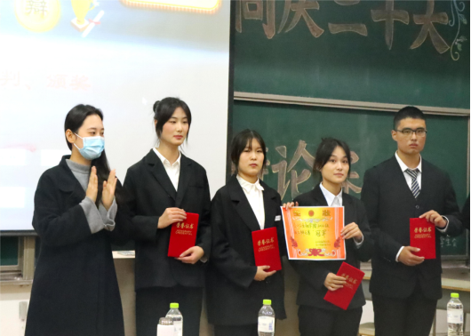 本次辩论赛围绕“网络使人更亲近还是更疏远”这一辩题展开。比赛之初,双方一辩开篇立论,举例生动,阐明了双方观点,立意明确,理由充分,为之后的论证打下了良好的基础。紧接着,双方二辩针对辩题进一步展开论述,他们灵活辩论,机智表达。随后,双方三辩就对方的论点展开提问并作出回答。在答辩过程中,辩手犀利而又幽默的回答与提问,使得在场观众沉浸其中。决赛现场气氛紧张激烈,双方辩手不相上下,滔滔不绝,观众激情澎湃。在经过激烈的自由辩论环节后,双方四辩进行总结陈词,力证了自身观点。在同学们阵阵掌声中,本场比赛最终以反方获胜圆满结束。最后评委们对参赛双方给予鼓励和表扬,并且给出了合理的建议。