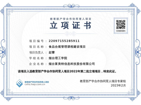 此次获批的2个项目得到了烟台富美特信息科技股份有限公司的大力支持,该公司是国内颇具影响力的基于互联网平台的食品行业专业综合性服务公司。多年来,食品与生物工程学院与烟台富美特信息科技股份有限公司本着相互尊重、优势互补、合作共赢的合作原则,在多个领域开展了卓有成效的合作,共同成功申报了2021年烟台市校地融合平台建设发展项目、烟台市特医食品重点实验室暨双师型教师重点培训基地。食品与生物工程学院将以此次协同育人项目为契机,进一步深化校企合作,致力于新工科及应用型课程建设、课程体系及教学内容改革,积极助推应用型高校建设。