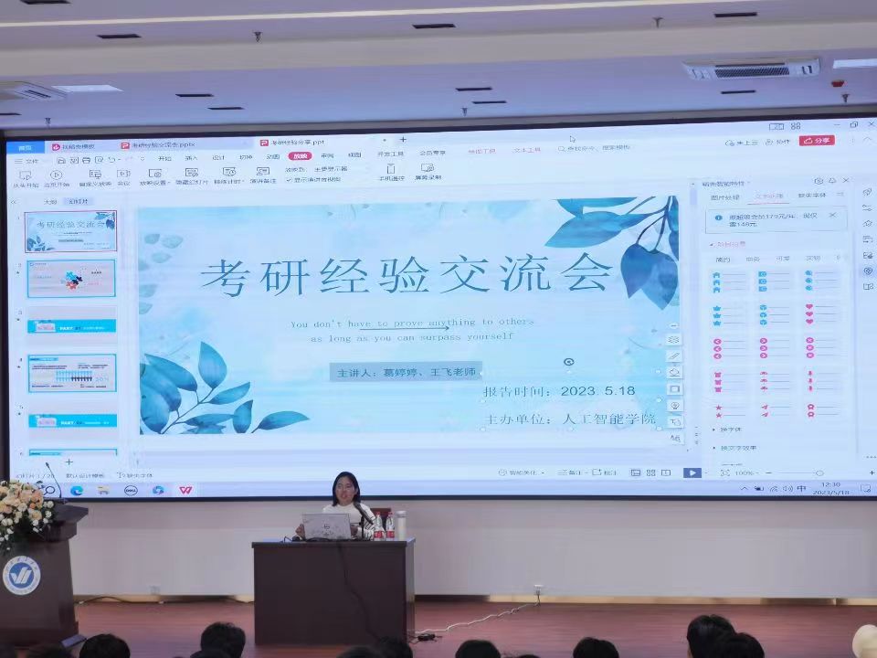 5月18日,人工智能学院于综合楼六楼举办考研经验交流会,旨在帮助同学们深入了解研究生考试,掌握备战技巧,明确学习目标。葛婷婷、王飞两位老师担任主讲。