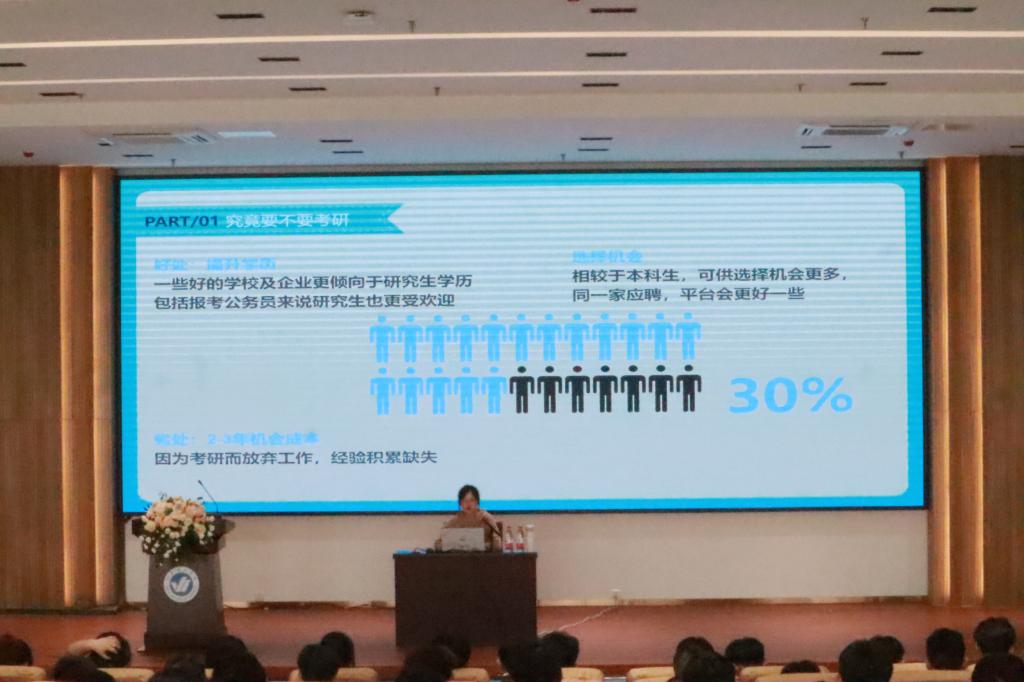 葛婷婷老师以“高效考研”为主题,分别从考研目的、考研目标、考研计划等方面给同学们做了深刻讲解。王飞老师以“快乐考研”为主题,列举成功考研的案例,结合实际情况给学生们提供了许多考研建议,让学生明确了考研目标,坚定考研决心。同学们纷纷表示,在听过老师们的详细讲解后,自己对考研学习的热情提高很多,也对考研过程有了一个更具体、更清晰的认识。